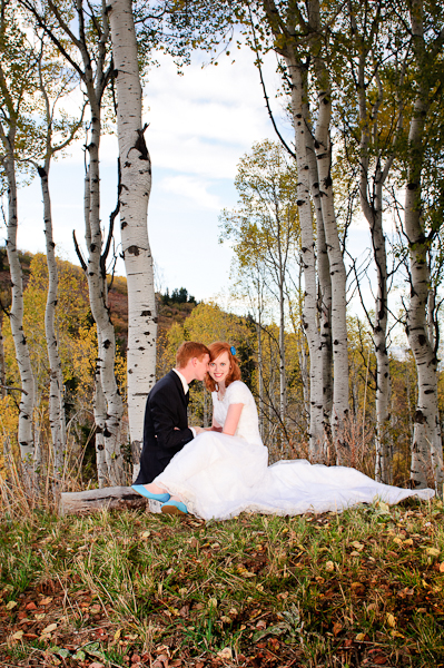 We celebrated our first anniversary three weeks ago. It was really great to be able to take a break and just be together with nothing to do. I'd forgotten that we made the brilliant decision to get married the day before what Weber hilariously calls 'Fall Break' (because it's 1 day. At the U we had a whole week.) So, this year our anniversary fell right on 'fall break' and Blake had work and school off. So Thursday we drove up to the cabin above Causey Dam and stayed there until Saturday afternoon. (Friday was our actual anniversary) We brought a ton of movies and spent alot of time sitting around snuggling on the couch watching them. We also thought it'd be fun to bring the camera and tripod and take pictures of ourselves all dressed up in our wedding clothes. So I got to have my picture taken in my dress for the 6th time. Who says you only wear your wedding dress once? On a separate note if anyone knows a good reliable place to get it cleaned that won't destroy my dress please let me know. It's long overdue. Anyways, we had so much fun taking the pictures that we decided to do it again the next evening too. I liked my hair more on the first day though, but oh well. It was a little frustrating taking pictures of ourselves, because it's not like you can keep the focus and framing really great, but it was alright to just take these pictures and not have to worry about how good they'd look because we just did them for fun. Blake got me a lovely anniversary gift to make it easier-a wireless remote shutter release. Romantic, I know. :) But really I love camera gadgets and so I was pretty excited. Anyways, enough chatting and on with the pics! I didn't really edit most of them, I figured it's about time I got this blog post put up and worry about perfect edits later.
