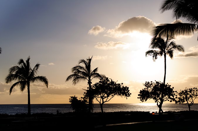 Then we went snorkeling again. This time we went to some man-made lagoons that were near some hotels on the west shore. I saw lots of Moorish Idols and some other fish, but the water wasn't as clear here (and lots deeper) than at Haunama Bay, and there weren't nearly as much fish. It was still a gorgeous place though. Especially at sunset. Oh, did I mention that we took my wedding dress along and Blake took pictures of me on the beaches at sunset? Yeah, it was amazing. I'll show those pictures off sometime. But for now, enjoy the lagoon minus bride. :) (Oh yeah, and look at our cute new swimming suits! Blake's actually fits him now.)